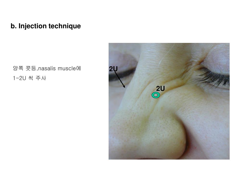 2U b. Injection technique 양쪽 콧등,nasalis muscle에 1-2U 씩 주사 2U