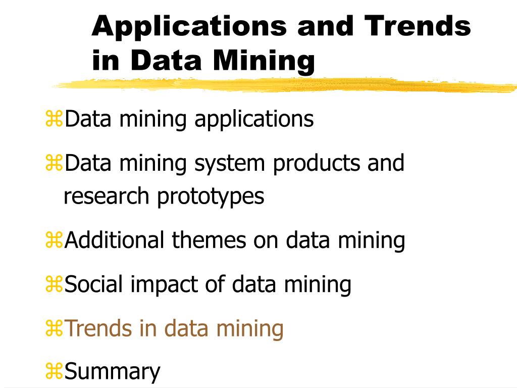 Applications and Trends in Data Mining • Data mining applications • Data mining system products and research prototypes • Additional themes on data mining • Social impact of data mining • Trends in data mining • Summary