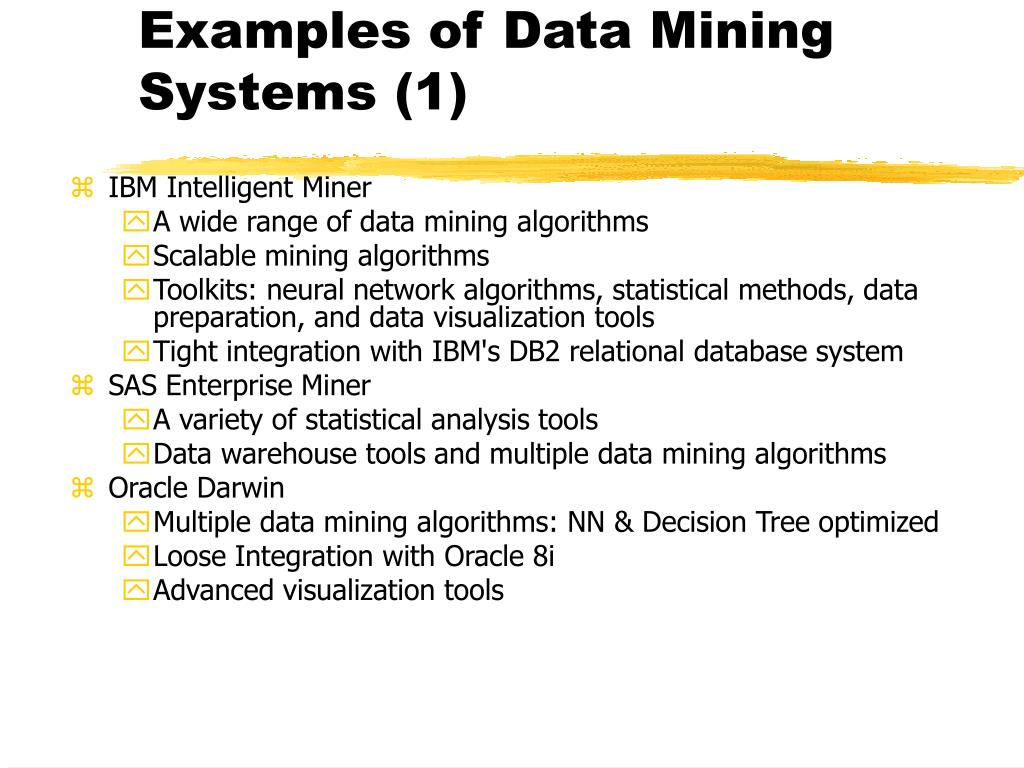 Examples of Data Mining Systems (1) • IBM Intelligent Miner • A wide range of data mining algorithms • Scalable mining algorithms • Toolkits: neural network algorithms, statistical methods, data preparation, and data visualization tools • Tight integration with IBM's DB2 relational database system • SAS Enterprise Miner • A variety of statistical analysis tools • Data warehouse tools and multiple data mining algorithms • Oracle Darwin • Multiple data mining algorithms: NN & Decision Tree optimized • Loose Integration with Oracle 8i • Advanced visualization tools