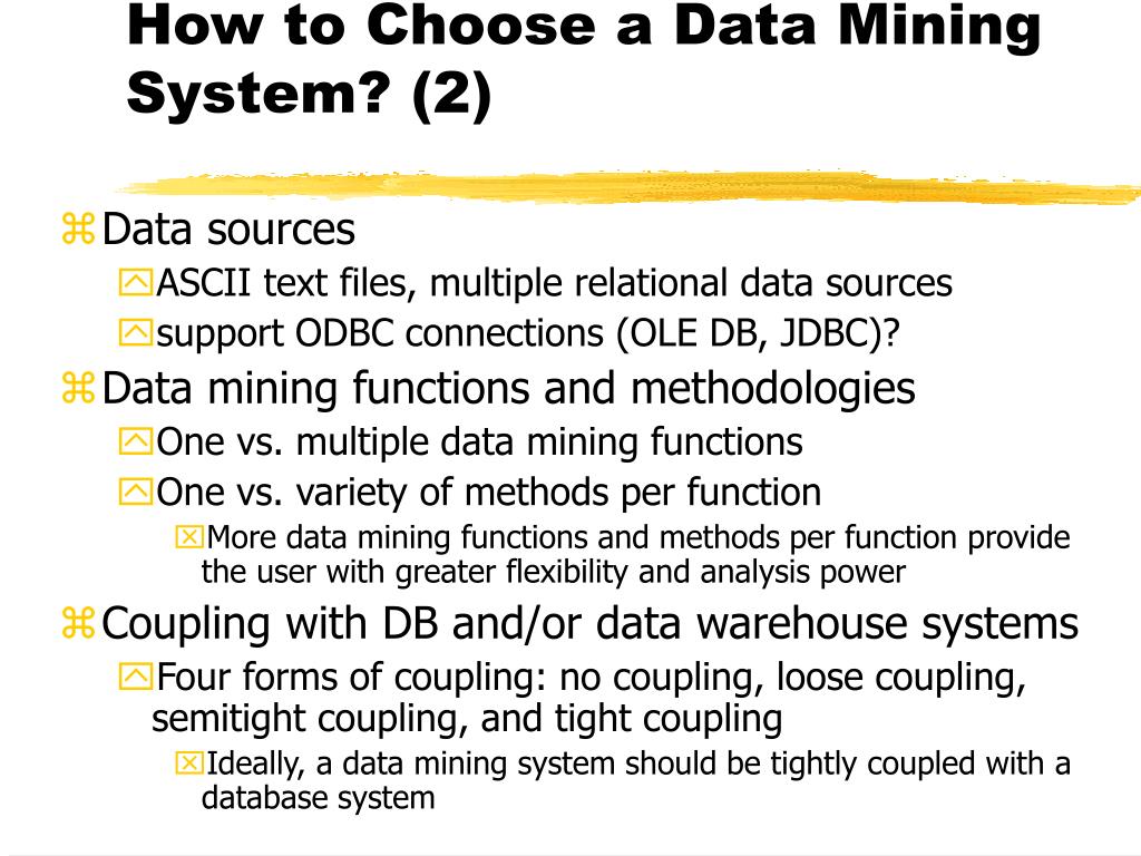How to Choose a Data Mining System? (2) • Data sources • ASCII text files, multiple relational data sources • support ODBC connections (OLE DB, JDBC)? • Data mining functions and methodologies • One vs. multiple data mining functions • One vs. variety of methods per function • More data mining functions and methods per function provide the user with greater flexibility and analysis power • Coupling with DB and/or data warehouse systems • Four forms of coupling: no coupling, loose coupling, semitight coupling, and tight coupling • Ideally, a data mining system should be tightly coupled with a database system