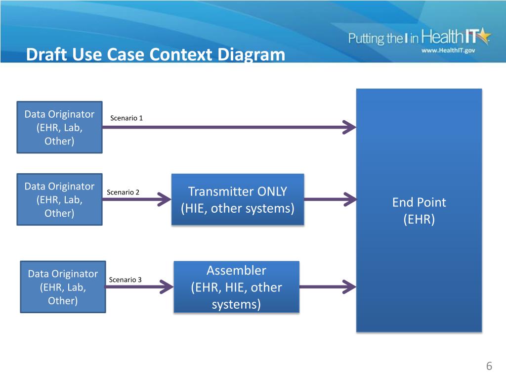 Draft Use Case Context Diagram End Point (EHR) Data Originator (EHR, Lab, Other) Scenario 1 Transmitter ONLY (HIE, other systems) Data Originator (EHR, Lab, Other) Scenario 2 Data Originator (EHR, Lab, Other) Assembler (EHR, HIE, other systems) Scenario 3