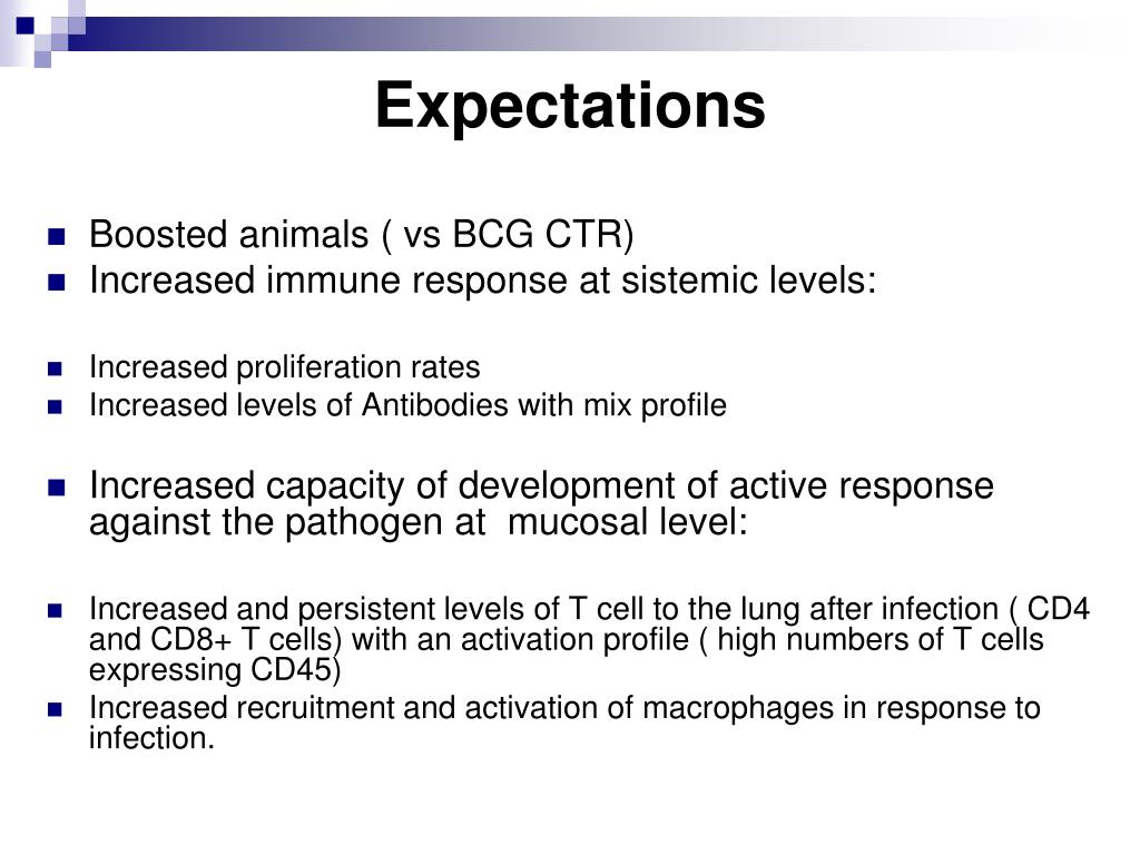 Expectations • Boosted animals ( vs BCG CTR) • Increased immune response at sistemic levels: • Increased proliferation rates • Increased levels of Antibodies with mix profile • Increased capacity of development of active response against the pathogen at mucosal level: • Increased and persistent levels of T cell to the lung after infection ( CD4 and CD8+ T cells) with an activation profile ( high numbers of T cells expressing CD45) • Increased recruitment and activation of macrophages in response to infection.