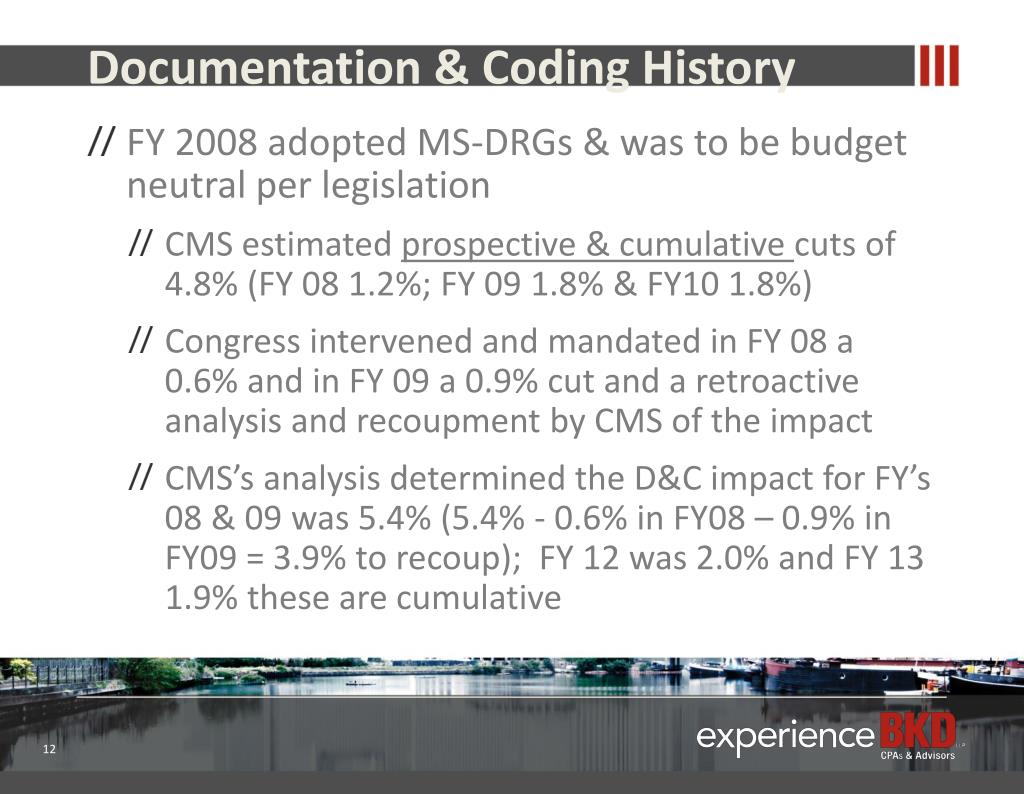 Documentation & Coding History • FY 2008 adopted MS-DRGs & was to be budget neutral per legislation • CMS estimated prospective & cumulative cuts of 4.8% (FY 08 1.2%; FY 09 1.8% & FY10 1.8%) • Congress intervened and mandated in FY 08 a 0.6% and in FY 09 a 0.9% cut and a retroactive analysis and recoupment by CMS of the impact • CMS’s analysis determined the D&C impact for FY’s 08 & 09 was 5.4% (5.4% - 0.6% in FY08 – 0.9% in FY09 = 3.9% to recoup); FY 12 was 2.0% and FY 13 1.9% these are cumulative