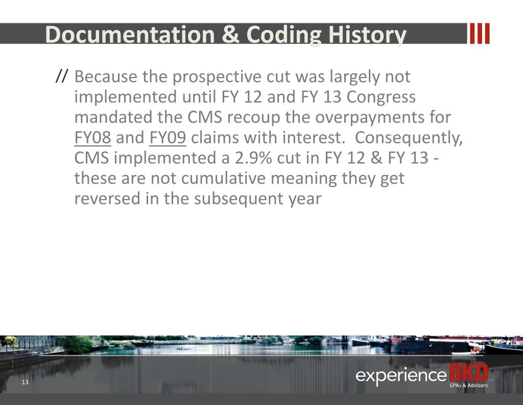 Documentation & Coding History • Because the prospective cut was largely not implemented until FY 12 and FY 13 Congress mandated the CMS recoup the overpayments for FY08 and FY09 claims with interest. Consequently, CMS implemented a 2.9% cut in FY 12 & FY 13 - these are not cumulative meaning they get reversed in the subsequent year