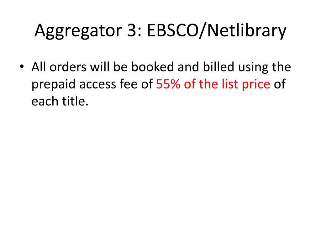 Aggregator 3: EBSCO/Netlibrary • All orders will be booked and billed using the prepaid access fee of 55% of the list price of each title.