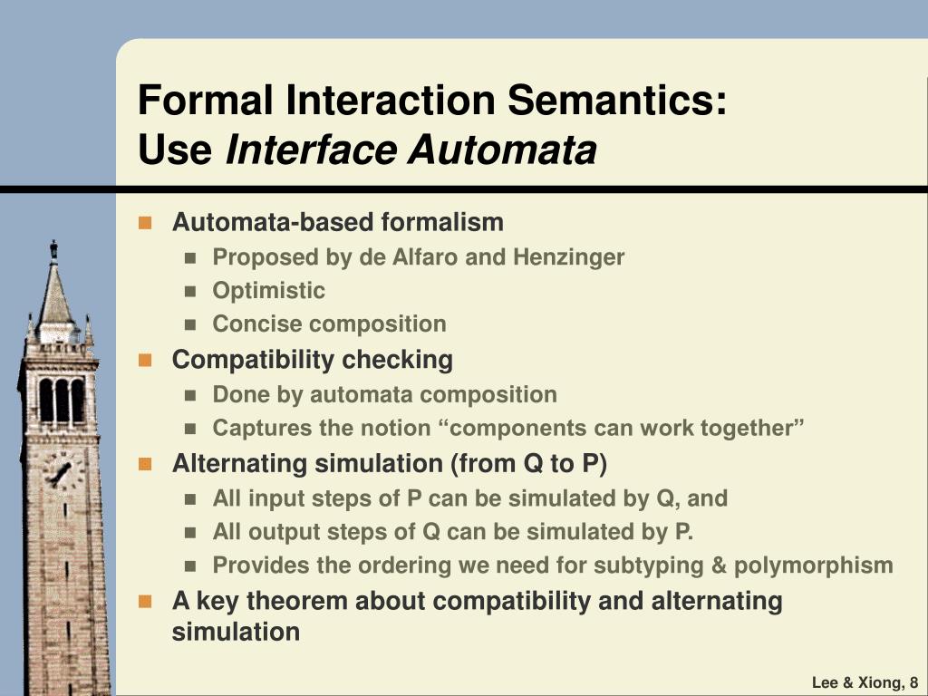 Outline • Component-based design • System-level types • Interface Automata • Interaction Types and Component Behavior • Type Checking • Type Order and Polymorphism • Design Tradeoffs • Conclusion