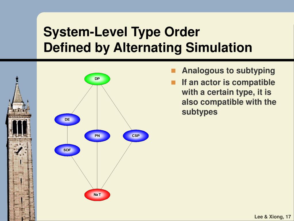 System-Level Type OrderDefined by Alternating Simulation • Analogous to subtyping • If an actor is compatible with a certain type, it is also compatible with the subtypes