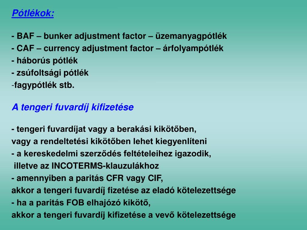 Pótlékok: • - BAF – bunker adjustment factor – üzemanyagpótlék • - CAF – currency adjustment factor – árfolyampótlék • - háborús pótlék • - zsúfoltsági pótlék • fagypótlék stb. • A tengeri fuvardíj kifizetése • - tengeri fuvardíjat vagy a berakási kikötőben, • vagy a rendeltetési kikötőben lehet kiegyenlíteni • - a kereskedelmi szerződés feltételeihez igazodik, • illetve az INCOTERMS-klauzulákhoz • - amennyiben a paritás CFR vagy CIF, • akkor a tengeri fuvardíj fizetése az eladó kötelezettsége • - ha a paritás FOB elhajózó kikötő, • akkor a tengeri fuvardíj kifizetése a vevő kötelezettsége