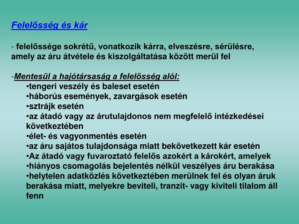 Felelősség és kár • - felelőssége sokrétű, vonatkozik kárra, elveszésre, sérülésre, • amely az áru átvétele és kiszolgáltatása között merül fel • -Mentesül a hajótársaság a felelősség alól: • tengeri veszély és baleset esetén • háborús események, zavargások esetén • sztrájk esetén • az átadó vagy az árutulajdonos nem megfelelő intézkedései következtében • élet- és vagyonmentés esetén • az áru sajátos tulajdonsága miatt bekövetkezett kár esetén • Az átadó vagy fuvaroztató felelős azokért a károkért, amelyek • hiányos csomagolás bejelentés nélkül veszélyes áru berakása • helytelen adatközlés következtében merülnek fel és olyan áruk berakása miatt, melyekre beviteli, tranzit- vagy kiviteli tilalom áll fenn