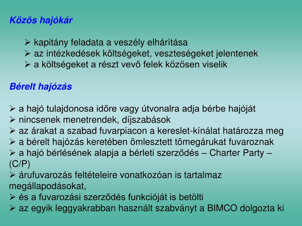 Közös hajókár • kapitány feladata a veszély elhárítása • az intézkedések költségeket, veszteségeket jelentenek • a költségeket a részt vevő felek közösen viselik • Bérelt hajózás • a hajó tulajdonosa időre vagy útvonalra adja bérbe hajóját • nincsenek menetrendek, díjszabások • az árakat a szabad fuvarpiacon a kereslet-kínálat határozza meg • a bérelt hajózás keretében ömlesztett tömegárukat fuvaroznak • a hajó bérlésének alapja a bérleti szerződés – Charter Party – (C/P) • árufuvarozás feltételeire vonatkozóan is tartalmaz megállapodásokat, • és a fuvarozási szerződés funkcióját is betölti • az egyik leggyakrabban használt szabványt a BIMCO dolgozta ki