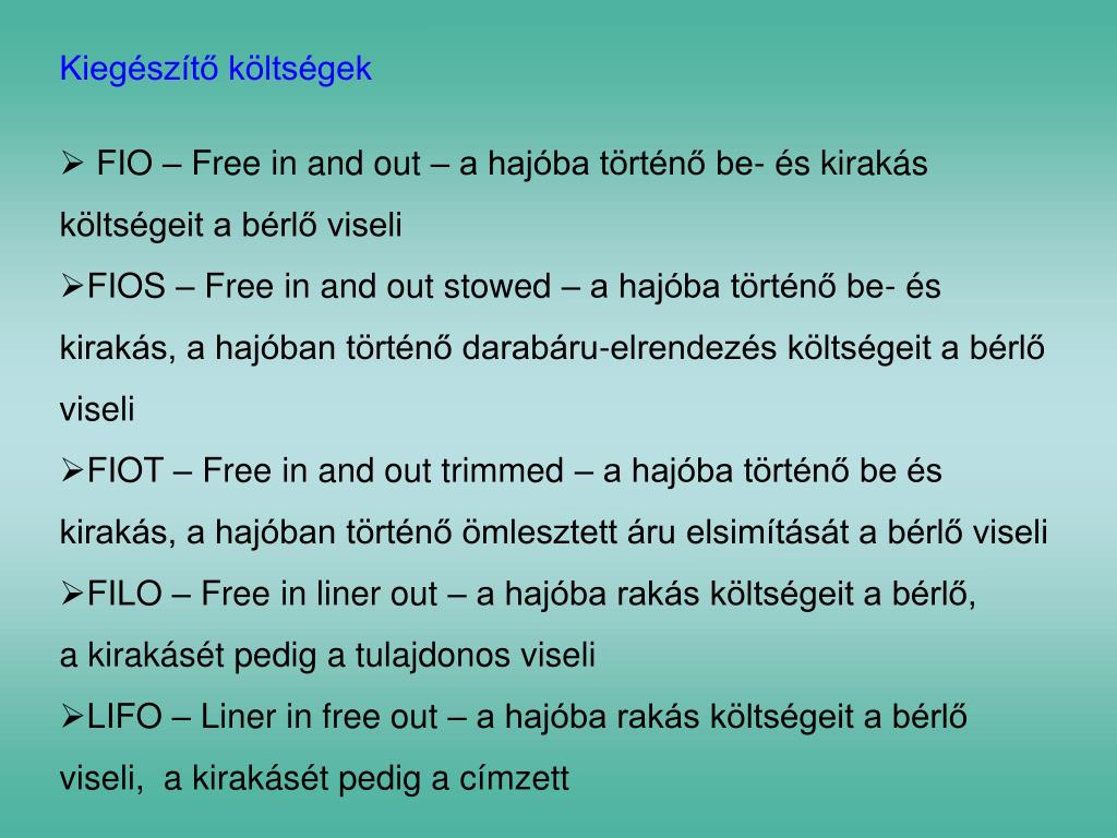 Kiegészítő költségek • FIO – Free in and out – a hajóba történő be- és kirakás költségeit a bérlő viseli • FIOS – Free in and out stowed – a hajóba történő be- és kirakás, a hajóban történő darabáru-elrendezés költségeit a bérlő viseli • FIOT – Free in and out trimmed – a hajóba történő be és kirakás, a hajóban történő ömlesztett áru elsimítását a bérlő viseli • FILO – Free in liner out – a hajóba rakás költségeit a bérlő, a kirakásét pedig a tulajdonos viseli • LIFO – Liner in free out – a hajóba rakás költségeit a bérlő viseli, a kirakásét pedig a címzett