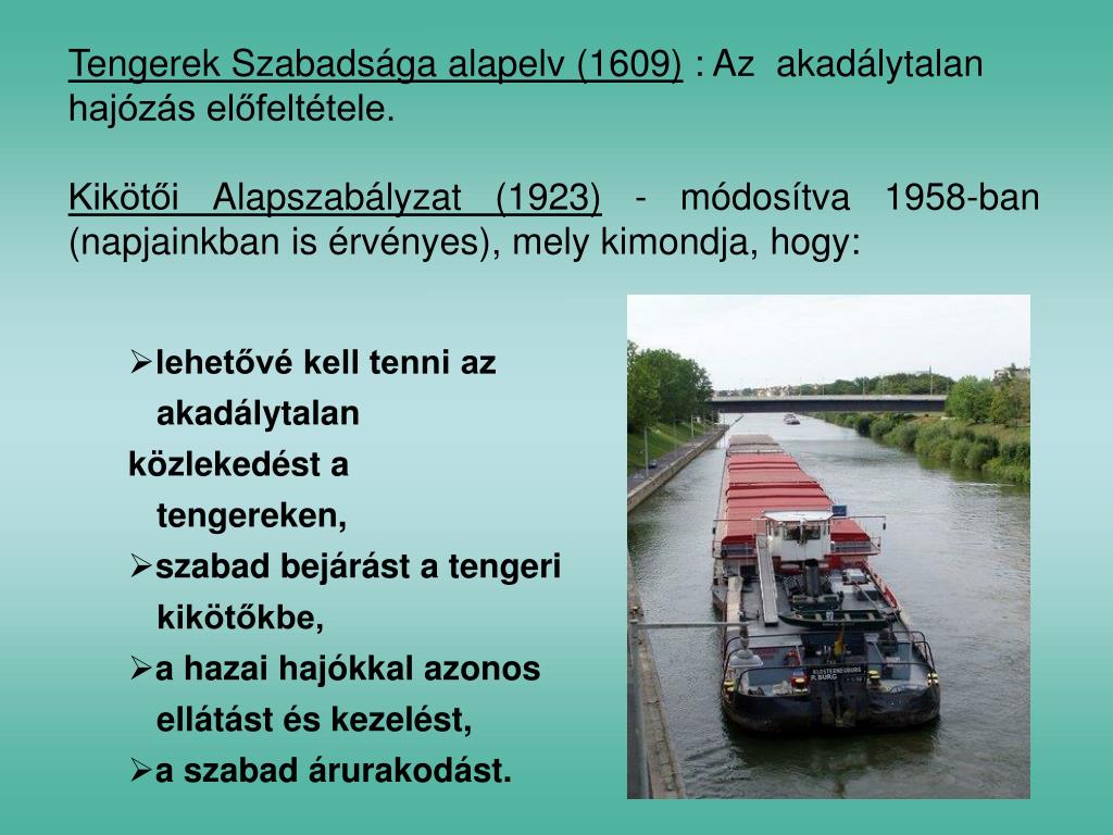 Tengerek Szabadsága alapelv (1609): Az akadálytalan hajózás előfeltétele. Kikötői Alapszabályzat (1923)- módosítva 1958-ban (napjainkban is érvényes), mely kimondja, hogy: • lehetővé kell tenni az akadálytalan közlekedést a tengereken, • szabad bejárást a tengeri kikötőkbe, • a hazai hajókkal azonos ellátást és kezelést, • a szabad árurakodást.