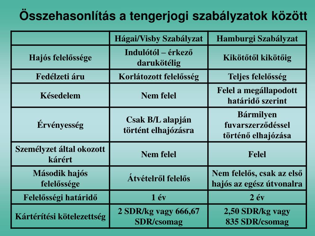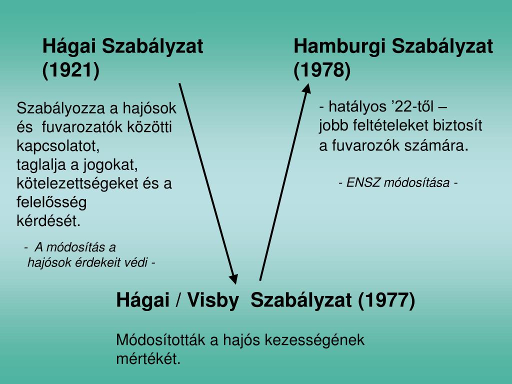 Hágai Szabályzat (1921) • Szabályozza a hajósok és fuvarozatók közötti kapcsolatot,taglalja a jogokat,kötelezettségeket és a felelősségkérdését. • Hamburgi Szabályzat (1978) • - hatályos ’22-től –jobb feltételeket biztosíta fuvarozók számára. - ENSZ módosítása - - A módosítás a hajósok érdekeit védi - Hágai / Visby Szabályzat (1977) Módosították a hajós kezességénekmértékét.