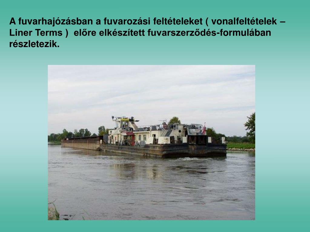 Fuvarozási szerződés létrejötte • A vonalhajózási szerződés hajótérfoglalással és hajótérkönyvelésseljön létre. • Ennek 2 változata: • Végleges hajótérkönyvelés - fix booking • Meghatározott hajóteret biztosít • Megnevezett kikötőből, megnevezett kikötőbe • Feltételes hajótérkönyvelés – booking with option • Fuvaroztató nem tud végleges adatokat • Feltételesen foglalja hajóteret