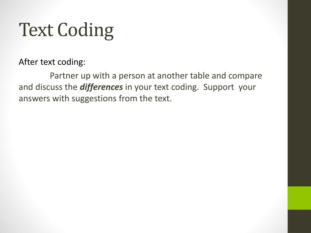 Text Coding After text coding: Partner up with a person at another table and compare and discuss the differences in your text coding. Support your answers with suggestions from the text.