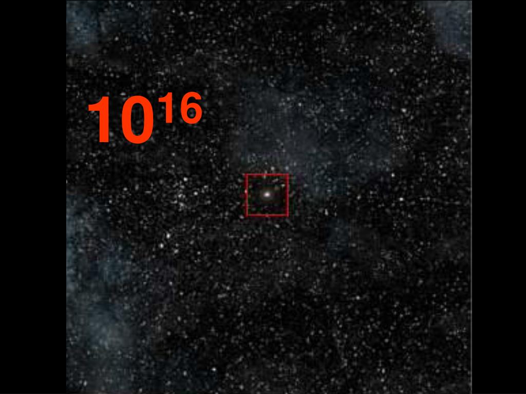1023 - 10 milioni di anni-luce Da questa distanza enorme rispetto all’origine, le galassie sembrano piccoli agglomerati e, tra loro, ci sono immensi “spazi vuoti”. Del resto è la stessa legge che governa tutti i corpi dell’universo.Potremmo continuare a viaggiare “verso l’alto” con la nostra immaginazione, ma, ora, torniamo “a casa” velocemente...