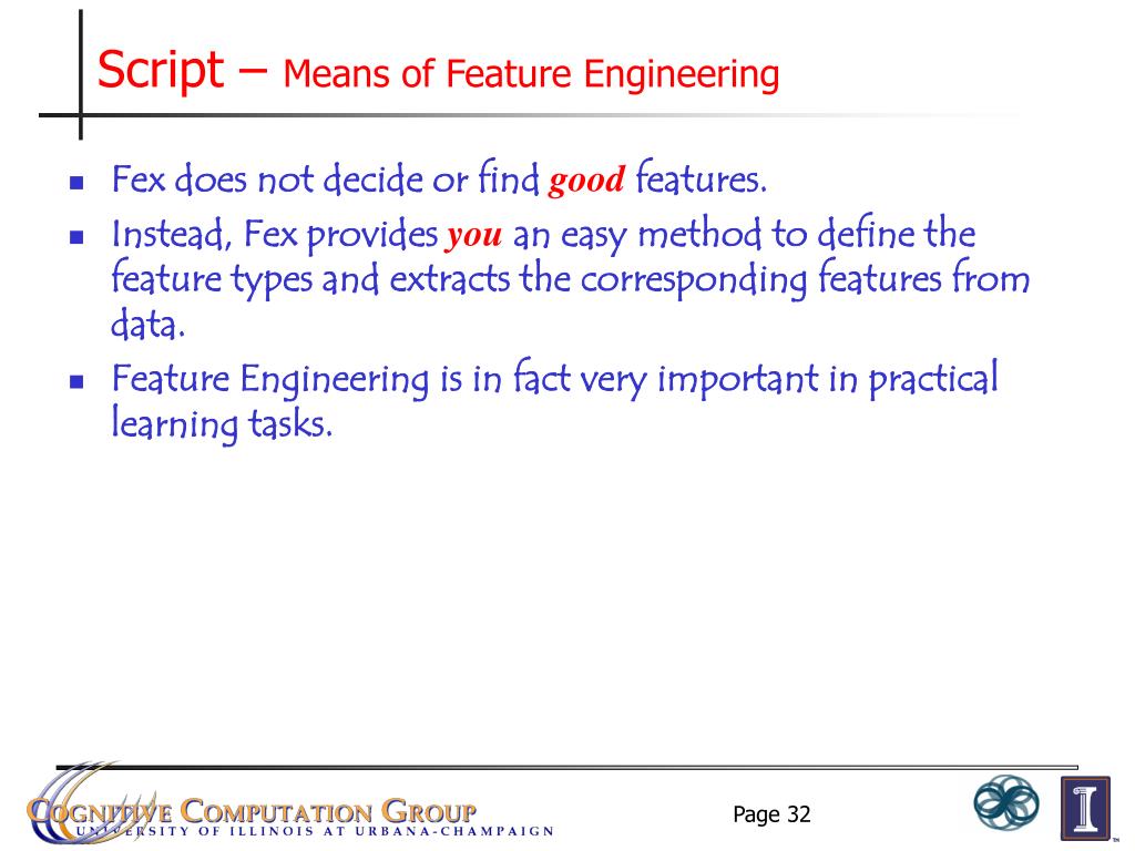 Script – Means of Feature Engineering • Fex does not decide or find good features. • Instead, Fex provides you an easy method to define the feature types and extracts the corresponding features from data. • Feature Engineering is in fact very important in practical learning tasks.
