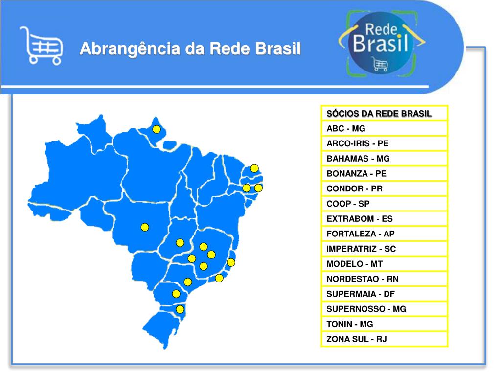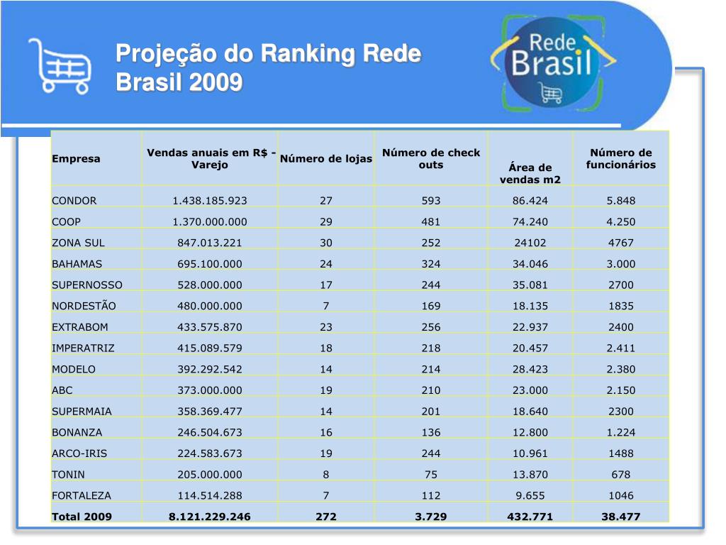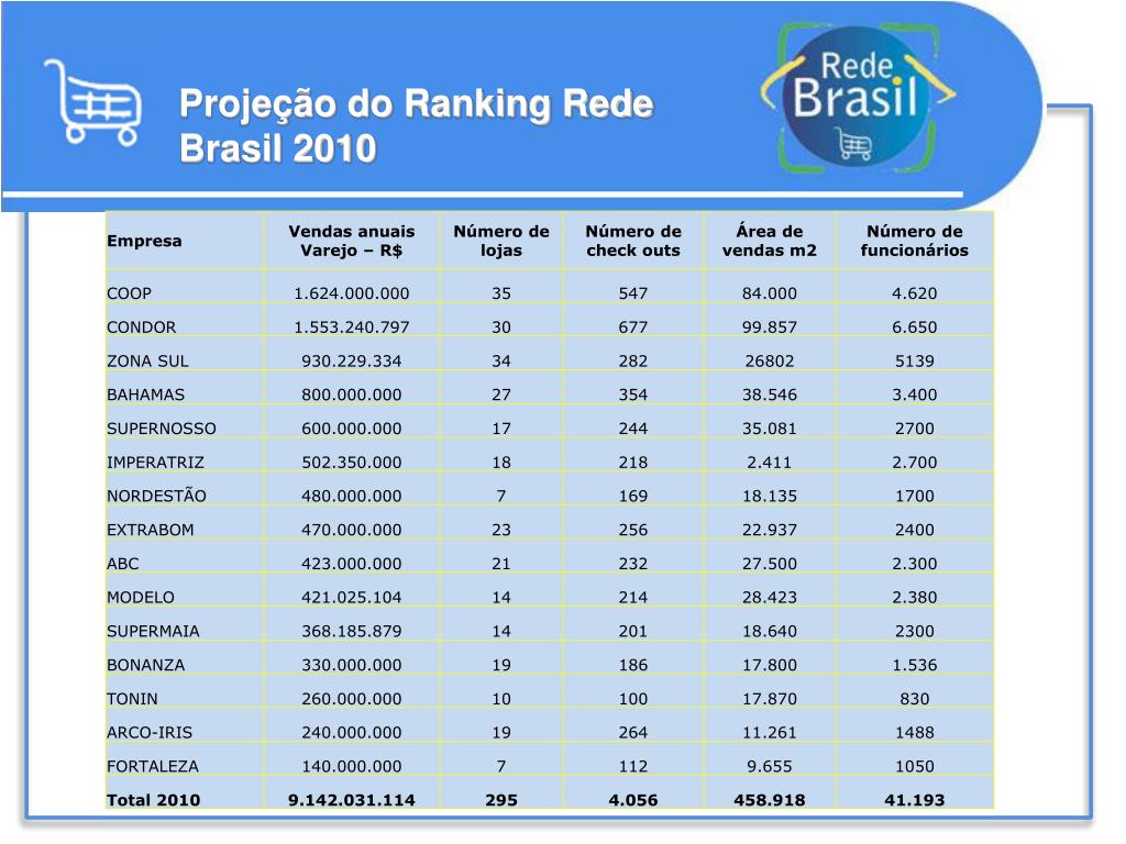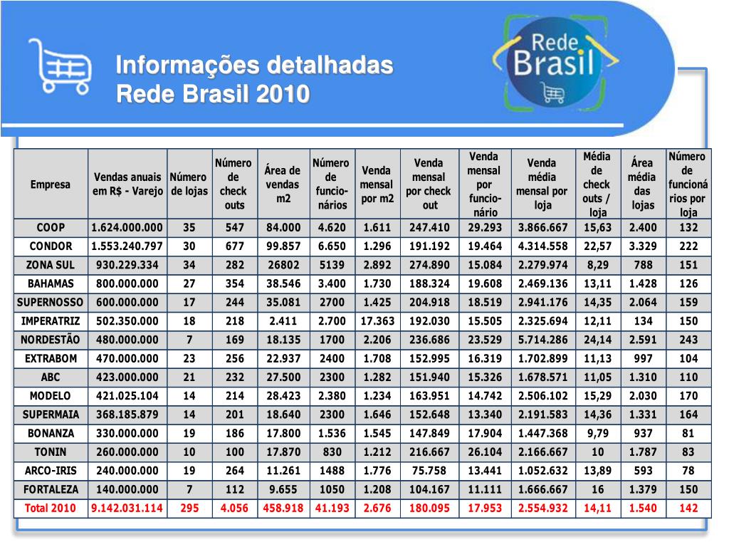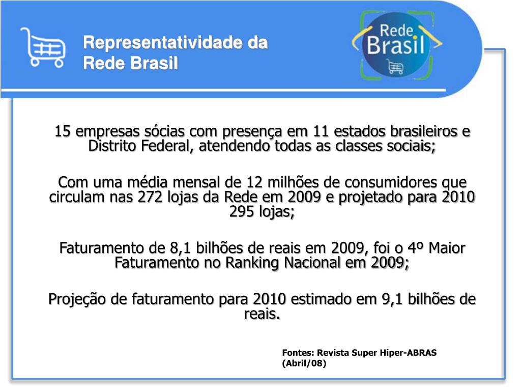 Representatividade da Rede Brasil 15 empresas sócias com presença em 11 estados brasileiros e Distrito Federal, atendendo todas as classes sociais; Com uma média mensal de 12 milhões de consumidores que circulam nas 272 lojas da Rede em 2009 e projetado para 2010 295 lojas; Faturamento de 8,1 bilhões de reais em 2009, foi o 4º Maior Faturamento no Ranking Nacional em 2009; Projeção de faturamento para 2010 estimado em 9,1 bilhões de reais. Fontes: Revista Super Hiper-ABRAS (Abril/08)