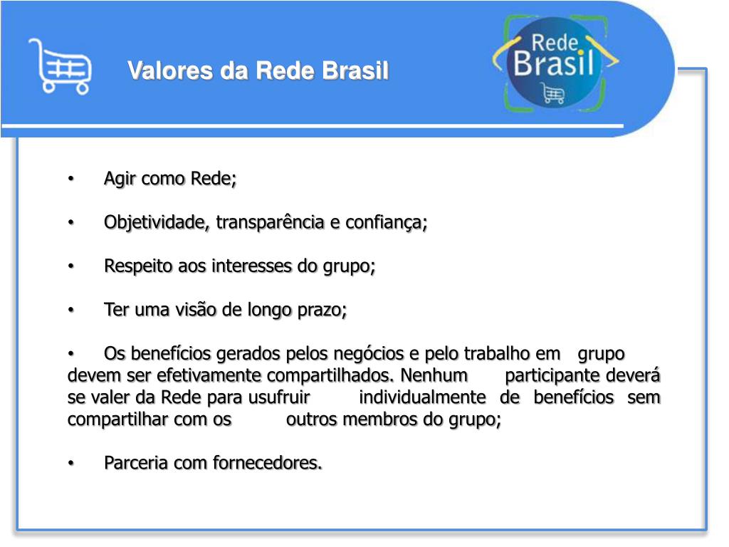 Valores da Rede Brasil • Agir como Rede; • Objetividade, transparência e confiança; • Respeito aos interesses do grupo; • Ter uma visão de longo prazo; • Os benefícios gerados pelos negócios e pelo trabalho em grupo devem ser efetivamente compartilhados. Nenhum participante deverá se valer da Rede para usufruir individualmente de benefícios sem compartilhar com os outros membros do grupo; • Parceria com fornecedores.