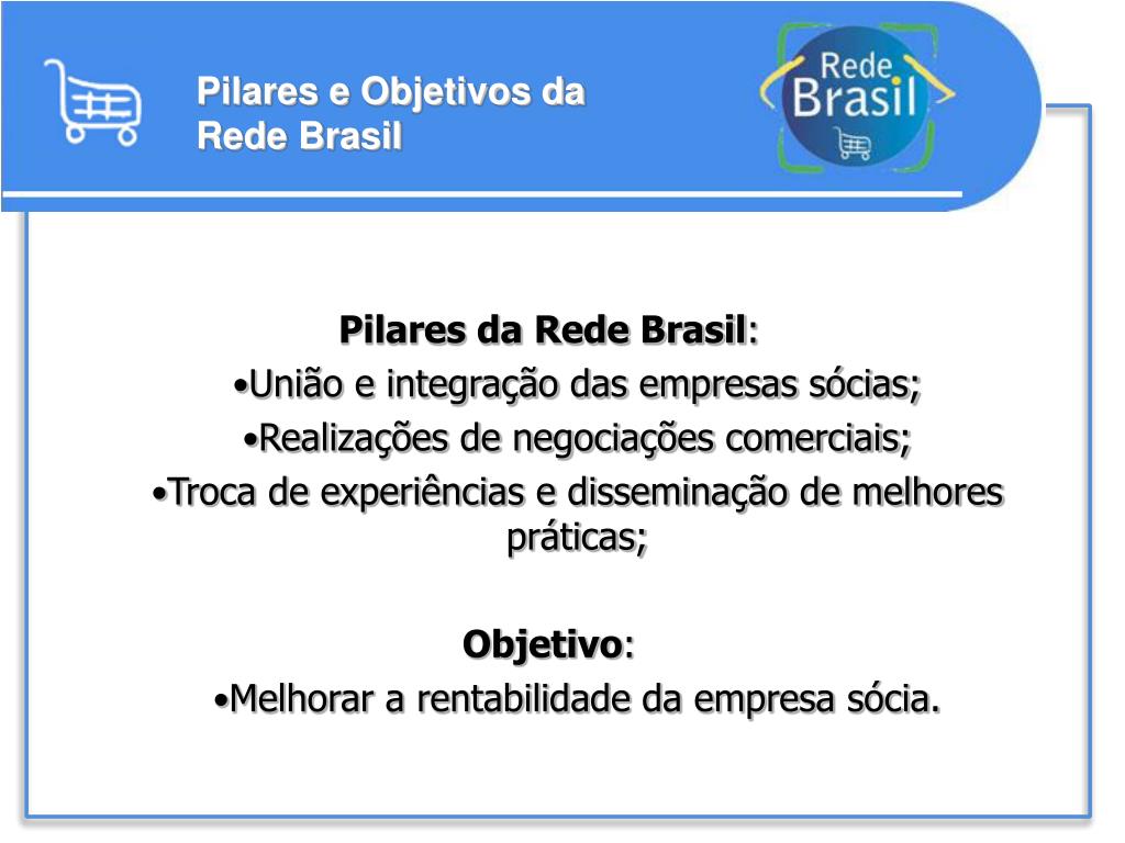 Pilares e Objetivos da Rede Brasil • Pilares da Rede Brasil: • União e integração das empresas sócias; • Realizações de negociações comerciais; • Troca de experiências e disseminação de melhores práticas; • Objetivo: • Melhorar a rentabilidade da empresa sócia.