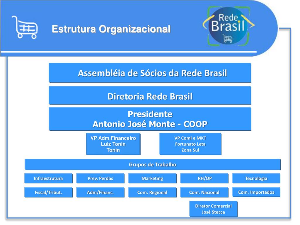 Estrutura Organizacional Assembléia de Sócios da Rede Brasil Diretoria Rede Brasil Presidente Antonio José Monte - COOP VP Adm.Financeiro Luiz Tonin Tonin VP Coml e MKT Fortunato Leta Zona Sul Grupos de Trabalho Infraestrutura Prev. Perdas Marketing RH/DP Tecnologia Fiscal/Tribut. Adm/Financ. Com. Regional Com. Nacional Com. Importados Diretor Comercial José Stecca
