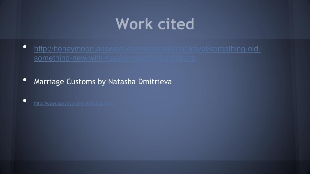 Work cited • http://honeymoon.answers.com/international-travel/something-old-something-new-with-russian-wedding-traditions • Marriage Customs by Natasha Dmitrieva • http://www.barynya.com/wedding.stm