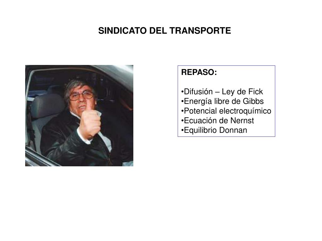SINDICATO DEL TRANSPORTE • REPASO: • Difusión – Ley de Fick • Energía libre de Gibbs • Potencial electroquímico • Ecuación de Nernst • Equilibrio Donnan