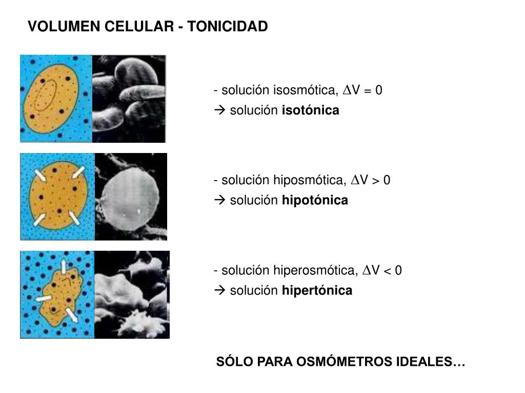 VOLUMEN CELULAR - TONICIDAD • solución isosmótica, DV = 0 • solución isotónica • solución hiposmótica, DV > 0 • solución hipotónica • solución hiperosmótica, DV < 0 • solución hipertónica SÓLO PARA OSMÓMETROS IDEALES…