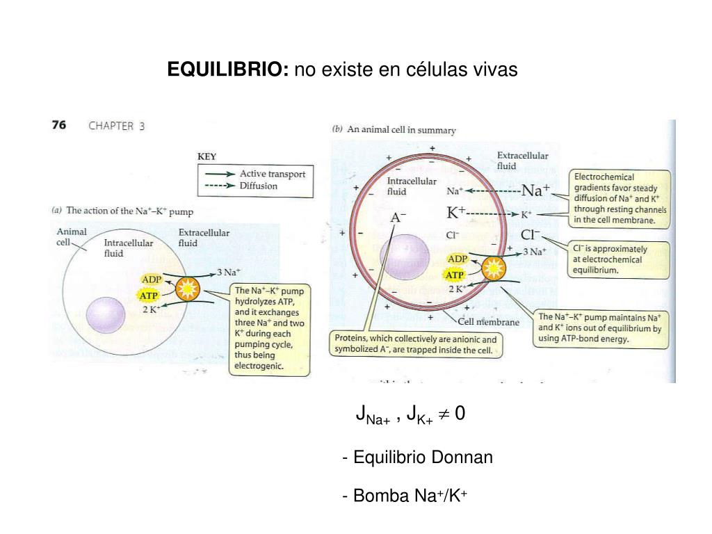 EQUILIBRIO: no existe en células vivas JNa+ , JK+ 0 - Equilibrio Donnan - Bomba Na+/K+