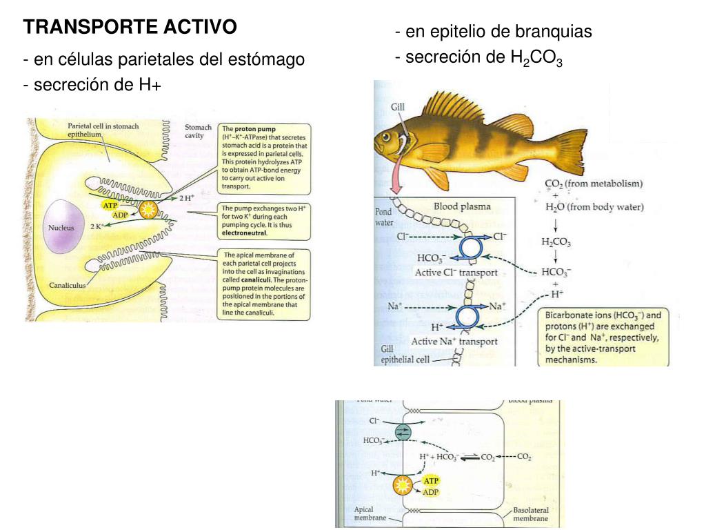 TRANSPORTE ACTIVO • en epitelio de branquias • secreción de H2CO3 • en células parietales del estómago • secreción de H+
