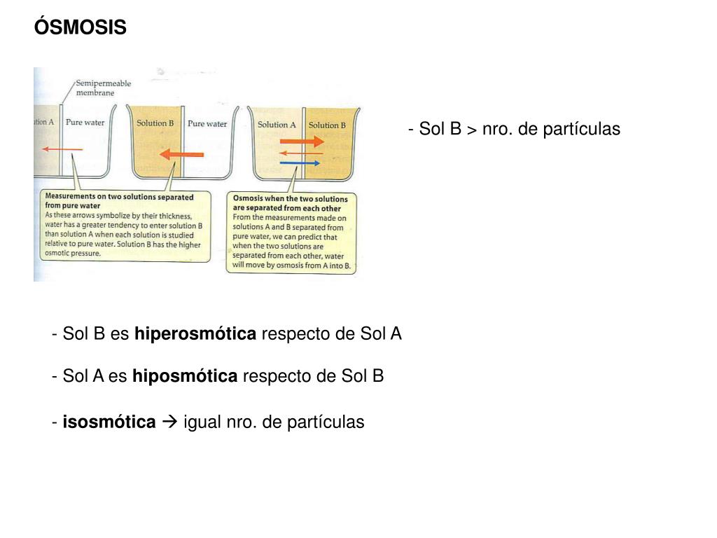 ÓSMOSIS - Sol B > nro. de partículas - Sol B es hiperosmótica respecto de Sol A - Sol A es hiposmótica respecto de Sol B - isosmótica igual nro. de partículas