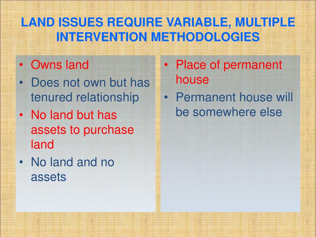 LAND ISSUES REQUIRE VARIABLE, MULTIPLE INTERVENTION METHODOLOGIES • Owns land • Does not own but has tenured relationship • No land but has assets to purchase land • No land and no assets • Place of permanent house • Permanent house will be somewhere else