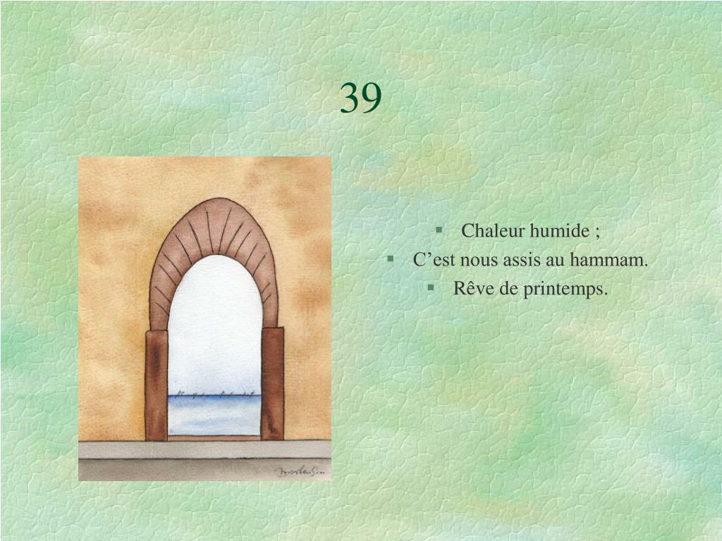 39 • Chaleur humide ; • C’est nous assis au hammam. • Rêve de printemps.