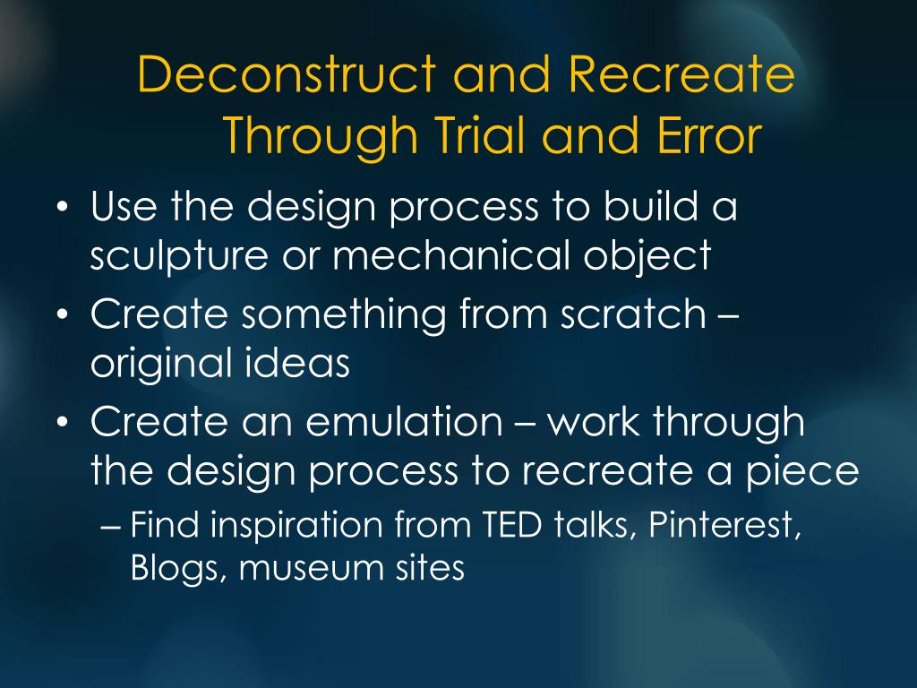 Deconstruct and Recreate Through Trial and Error • Use the design process to build a sculpture or mechanical object • Create something from scratch – original ideas • Create an emulation – work through the design process to recreate a piece • Find inspiration from TED talks, Pinterest, Blogs, museum sites