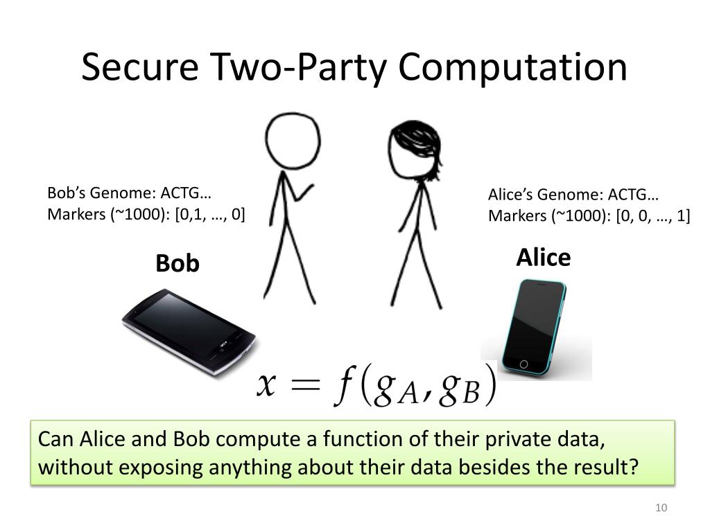 Secure Two-Party Computation Bob’s Genome: ACTG… Markers (~1000): [0,1, …, 0] Alice’s Genome: ACTG… Markers (~1000): [0, 0, …, 1] Alice Bob Can Alice and Bob compute a function of their private data, without exposing anything about their data besides the result?