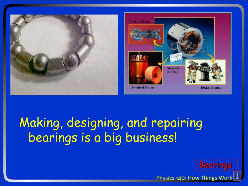 Bearings • Eliminate sliding friction in wheel hub • Behave like wheels (roll without slipping)