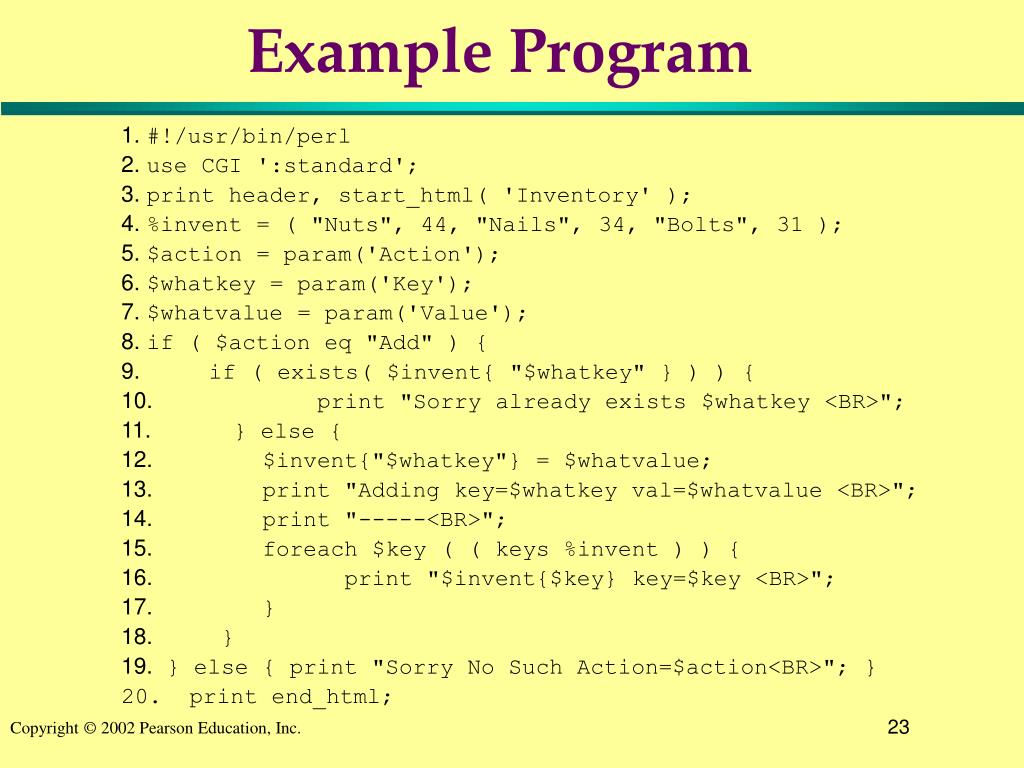 Example Program 1. #!/usr/bin/perl 2. use CGI ':standard'; 3. print header, start_html( 'Inventory' ); 4. %invent = ( "Nuts", 44, "Nails", 34, "Bolts", 31 ); 5. $action = param('Action'); 6. $whatkey = param('Key'); 7. $whatvalue = param('Value'); 8. if ( $action eq "Add" ) { 9. if ( exists( $invent{ "$whatkey" } ) ) { 10. print "Sorry already exists $whatkey <BR>"; 11. } else { 12. $invent{"$whatkey"} = $whatvalue; 13. print "Adding key=$whatkey val=$whatvalue <BR>"; 14. print "-----<BR>"; 15. foreach $key ( ( keys %invent ) ) { 16. print "$invent{$key} key=$key <BR>"; 17. } 18. } 19. } else { print "Sorry No Such Action=$action<BR>"; } 20. print end_html;