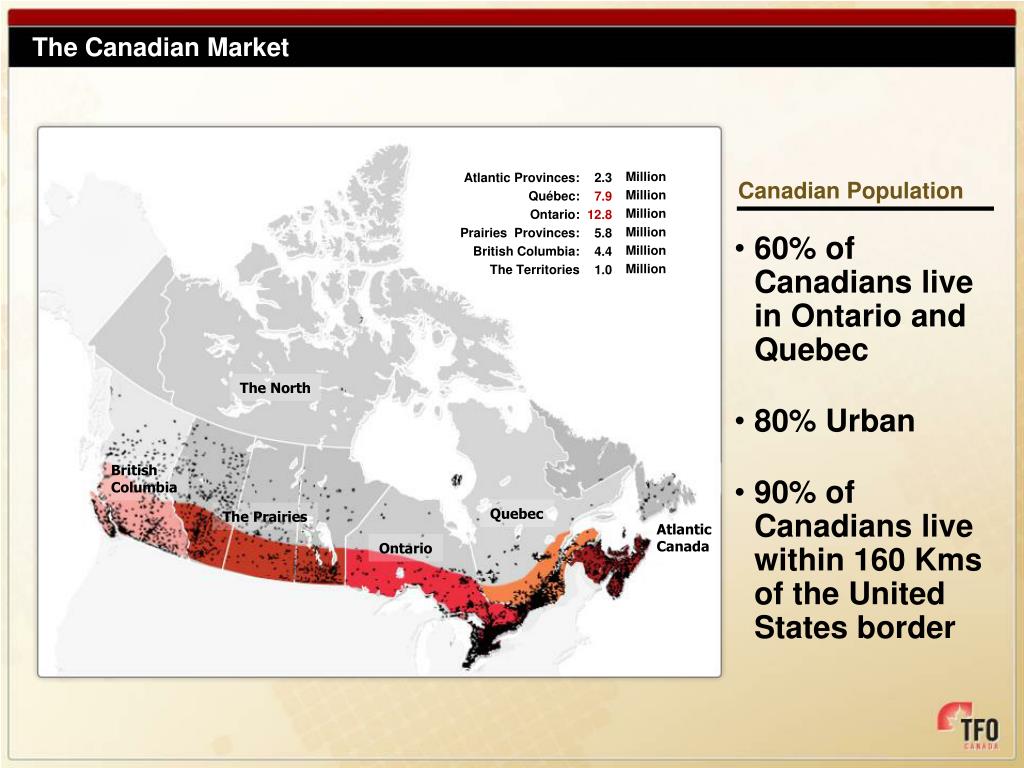 The Canadian Market Introduction to Canada • Second largest • country in the world • Small, concentrated population • Six market regions • 10% size of U.S. market The North British Columbia Quebec The Prairies Atlantic Canada Ontario Total population (Census 2011): 33.4 millions