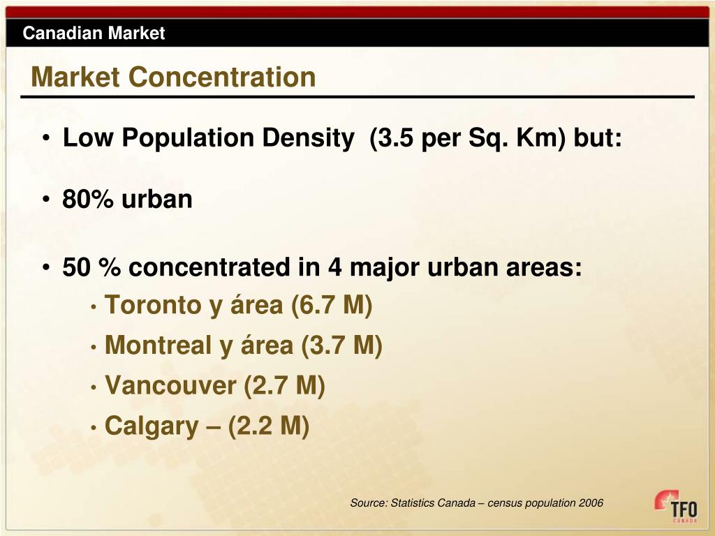 Low Population Density (3.5 per Sq. Km) but: 80% urban 50 % concentrated in 4 major urban areas: Toronto y área (6.7 M) Montreal y área (3.7 M) Vancouver (2.7 M) Calgary – (2.2 M) Canadian Market Market Concentration Source: Statistics Canada – census population 2006