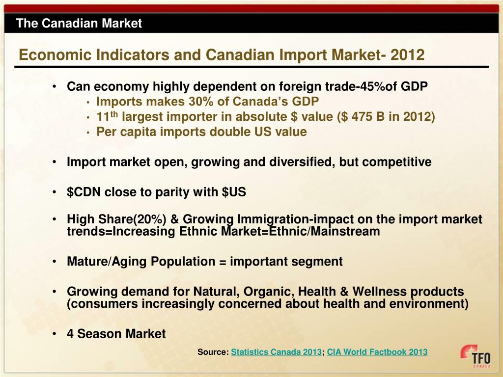 Can economy highly dependent on foreign trade-45%of GDP Imports makes 30% of Canada’s GDP 11th largest importer in absolute $ value ($ 475 B in 2012) Per capita imports double US value Import market open, growing and diversified, but competitive $CDN close to parity with $US High Share(20%) & Growing Immigration-impact on the import market trends=Increasing Ethnic Market=Ethnic/Mainstream Mature/Aging Population = important segment Growing demand for Natural, Organic, Health & Wellness products (consumers increasingly concerned about health and environment) 4 Season Market The Canadian Market Economic Indicators and Canadian Import Market- 2012 Source: Statistics Canada 2013; CIA World Factbook 2013
