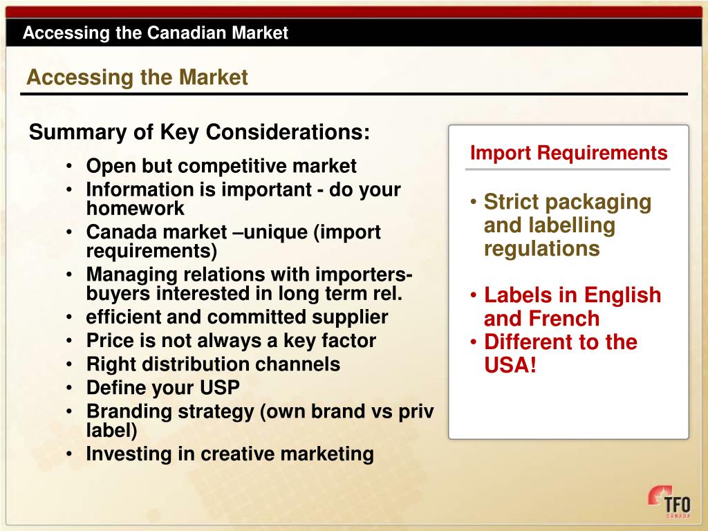 Open but competitive market Information is important - do your homework Canada market –unique (import requirements) Managing relations with importers-buyers interested in long term rel. efficient and committed supplier Price is not always a key factor Right distribution channels Define your USP Branding strategy (own brand vs priv label) Investing in creative marketing Accessing the Canadian Market Accessing the Market Summary of Key Considerations: Import Requirements • Strict packaging and labelling regulations • Labels in English and French • Different to the USA!