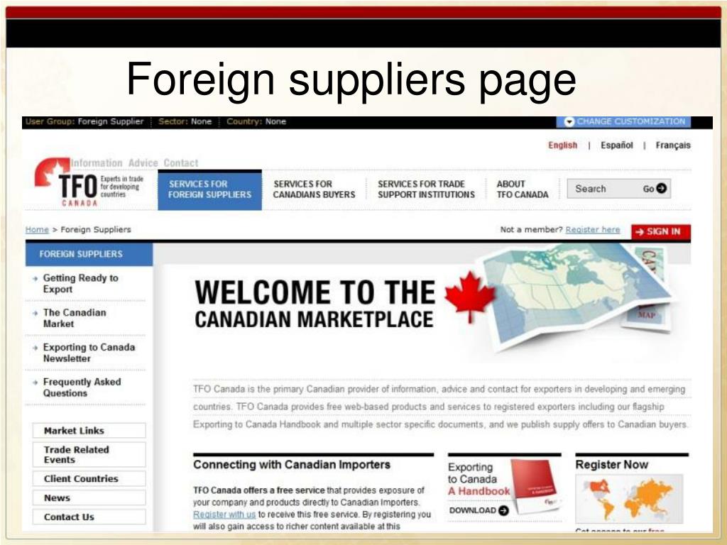 TFO Canada: Information/Promotion Once Jordanian companies register on TFO web site: www.tfocanada.ca will benefit from (at no cost): Information: Handbook on Exporting to Canada, market report by sector, links, TFO Export News newsletter Promotional Match-Making Services: Export offfer published en ImportInfo ( sent to aprox. 1400 registered Can importers) Registration in the Supplier Database