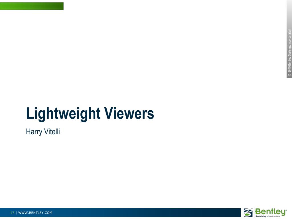 Navigator Product Strategy • Visualization platform across asset information lifecycle • Performance, API for third parties • Visa’s for design, simulation, analysis, construction, operations • Continue w/broad distribution, low price • Light-up ProjectWise services (i.e. closed loop redlining) • Take brand into other viewers (Tablet, Web)
