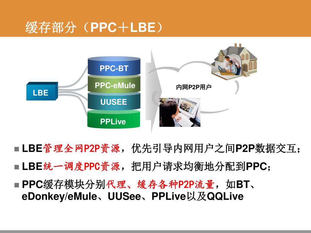缓存部分(PPC+LBE) • LBE管理全网P2P资源,优先引导内网用户之间P2P数据交互; • LBE统一调度PPC资源,把用户请求均衡地分配到PPC; • PPC缓存模块分别代理、缓存各种P2P流量,如BT、eDonkey/eMule、UUSee、PPLive以及QQLive PPC-BT Text PPC-eMule 内网P2P用户 LBE UUSEE PPLive