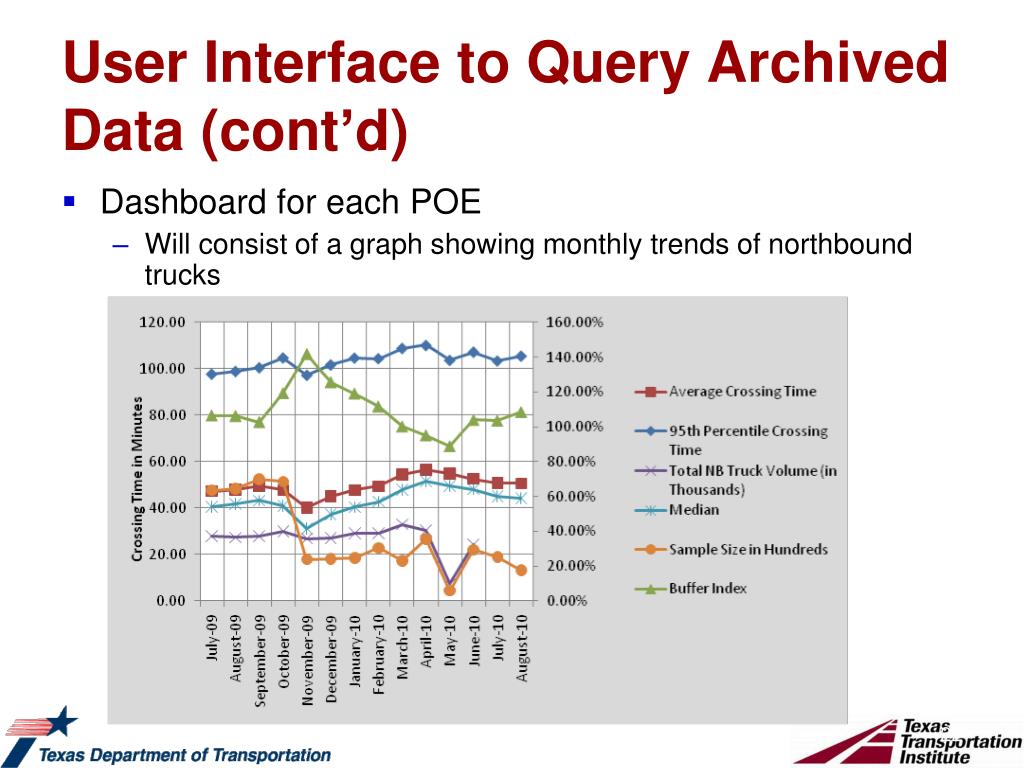 User Interface to Query Archived Data (cont’d) • Dashboard for each POE • Will consist of a graph showing monthly trends of northbound trucks 22
