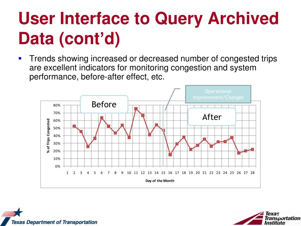 User Interface to Query Archived Data (cont’d) Operational Improvement/Changes Before After Trends showing increased or decreased number of congested trips are excellent indicators for monitoring congestion and system performance, before-after effect, etc. 23