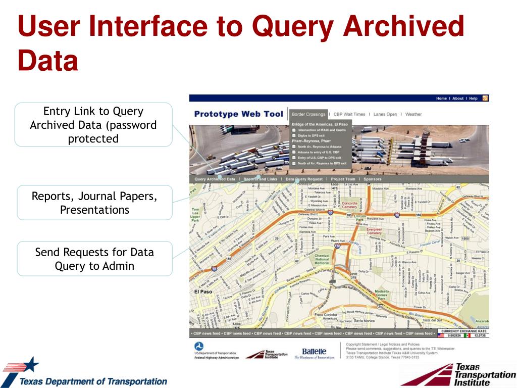 NextSteps • Working with Texas DPS to collect truck volumes at land POEs on a close to real time basis • Start Wait Time study at Zaragoza Bridge in El Paso • Commercial vehicles northbound • POVs northbound and southbound • Pick up Dissemination project from the Web Prototype FHWA study and begin disseminating data to stakeholders via the Internet, mobile phone, and reports. • Analyze the data and make recommendations on improvements in the border crossing processes. • Currently working on contract to start theses projects thanks to a grant from the FHWA.