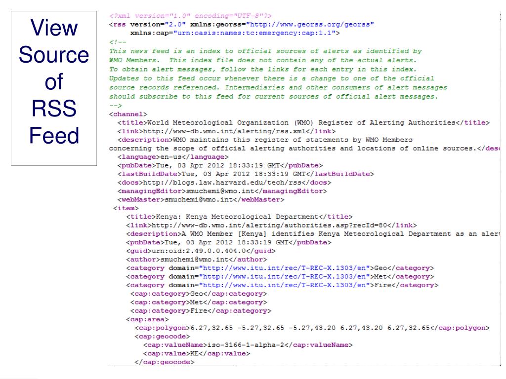 RSS Feed for Changes in Registered Authoritieshttp://www-db.wmo.int/alerting/rss.xml The International Register of Alerting Authorities