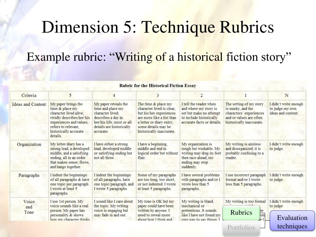 Dimension 5: Technique Rubrics Examplerubric: “Writing of a historical fiction story” Rubrics Evaluation techniques Portfolios