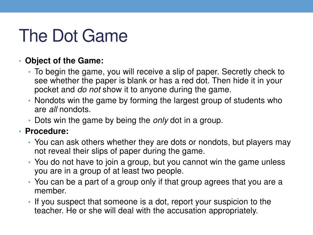 The Dot Game • Object of the Game: • To begin the game, you will receive a slip of paper. Secretly check to see whether the paper is blank or has a red dot. Then hide it in your pocket and do not show it to anyone during the game. • Nondots win the game by forming the largest group of students who are all nondots. • Dots win the game by being the only dot in a group. • Procedure: • You can ask others whether they are dots or nondots, but players may not reveal their slips of paper during the game. • You do not have to join a group, but you cannot win the game unless you are in a group of at least two people. • You can be a part of a group only if that group agrees that you are a member. • If you suspect that someone is a dot, report your suspicion to the teacher. He or she will deal with the accusation appropriately.
